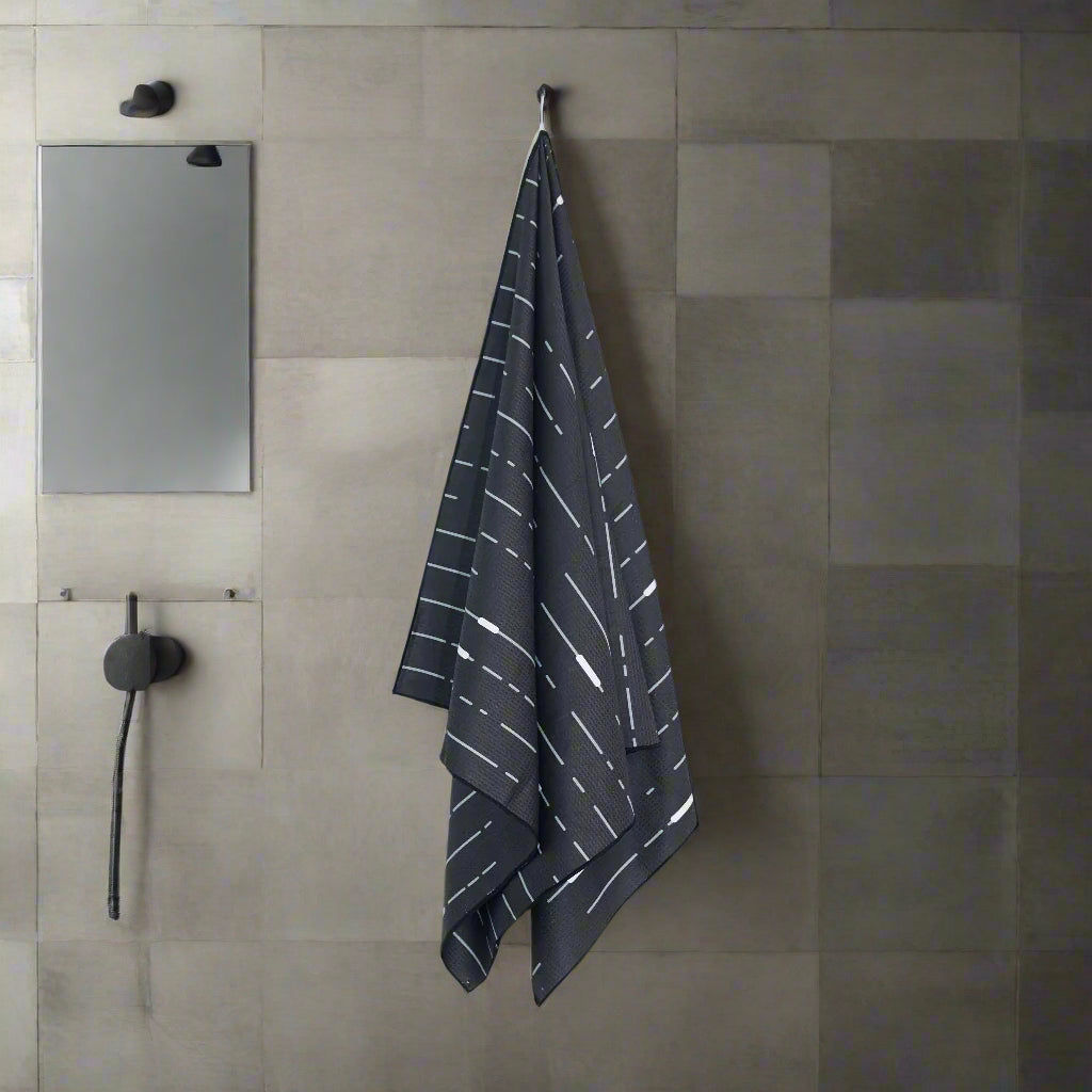 Made from premium ‘waffle weave’ microfiber, they’re slightly thicker than our ‘suede’ microfiber beach towels, offering that super soft ‘plush’ feel that we all know and love after a shower! Easy to hang anywhere with the handy hanging loop.