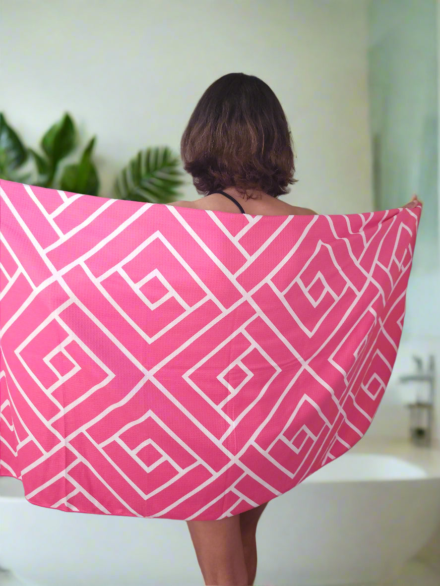 Made from premium ‘waffle weave’ microfiber, they’re slightly thicker than our ‘suede’ microfiber beach towels, offering that super soft ‘plush’ feel that we all know and love after a shower! Easy to hang anywhere with the handy hanging loop.